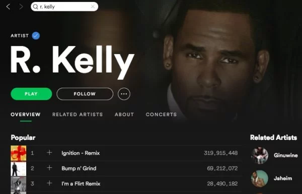 LIES! R. Kelly did not write Spotify or anybody else a check in recent years. He don’t even pay his rent on his atl homes so get real with your bogus lies! The truth of the matter is that this oppression from Spotify and #Mute Kelly backfired! His fans must think alike and we teamed up and streamed the hell out of his music so his streaming went up instead of down. Spotify also received threats from attorneys threatening lawsuits for discriminatiom. Furthermore, artists like Kendrick threatened to pull their music from Spotify if their racism continued. Let’s stick the facts here and not make up lies. SMH you cannot condemn someone based off of their race.