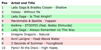 Released last week, Bradley Cooper duet ‘Shallow’ hasn’t loosened its grip atop of the tally, while ‘Is That Alright?’ presently sits at #3. Rounding out the pack is ‘Always Remember Us This Way’ at #6.