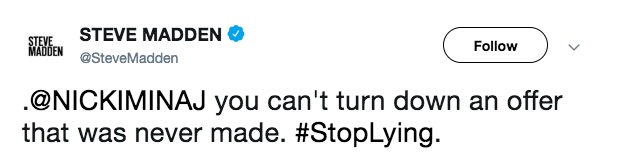 steve madden just proved he is un-professional. he doesnt know who in his company considered nicki, yes he gets the final say …..but to say he never considered giving the biggest queen of rapp music a deal….not even to consider it.. reallly steve????? you never considered the biggest rap star to promote your brand..he is a fkin liar