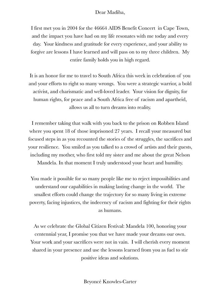 This was very nice of Beyonce’s team to make public. It’s nice to see that she appreciates those who have truly made an impact on the human condition. I will be watching to see what she does onstage at the Global Citizen Festival. Between preparing for that and voicing Nala, I’m sure she has been busy…Knowing her, she’s waiting for Kelly’s release date to drop an album LOL.