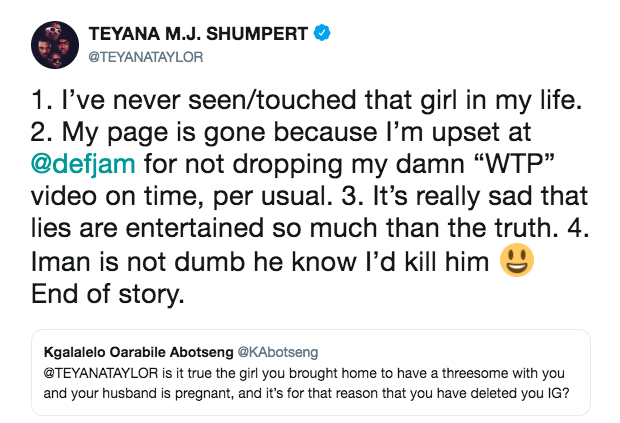 As at writing, the singer is trending on social media after the rumor-mill cranked into overdrive about husband Iman Shumpert and allegations that he impregnated a woman the couple had a threesome with.