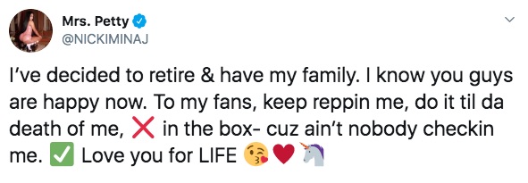 In breaking news, rapper Nicki Minaj has announced her retirement from music.