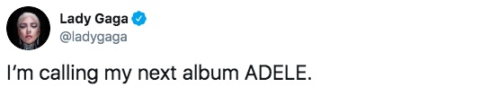 Moments ago, Gaga took to Twitter to share that the follow-up to 2016’s ‘Joanne’ LP is named… ‘ADELE.’