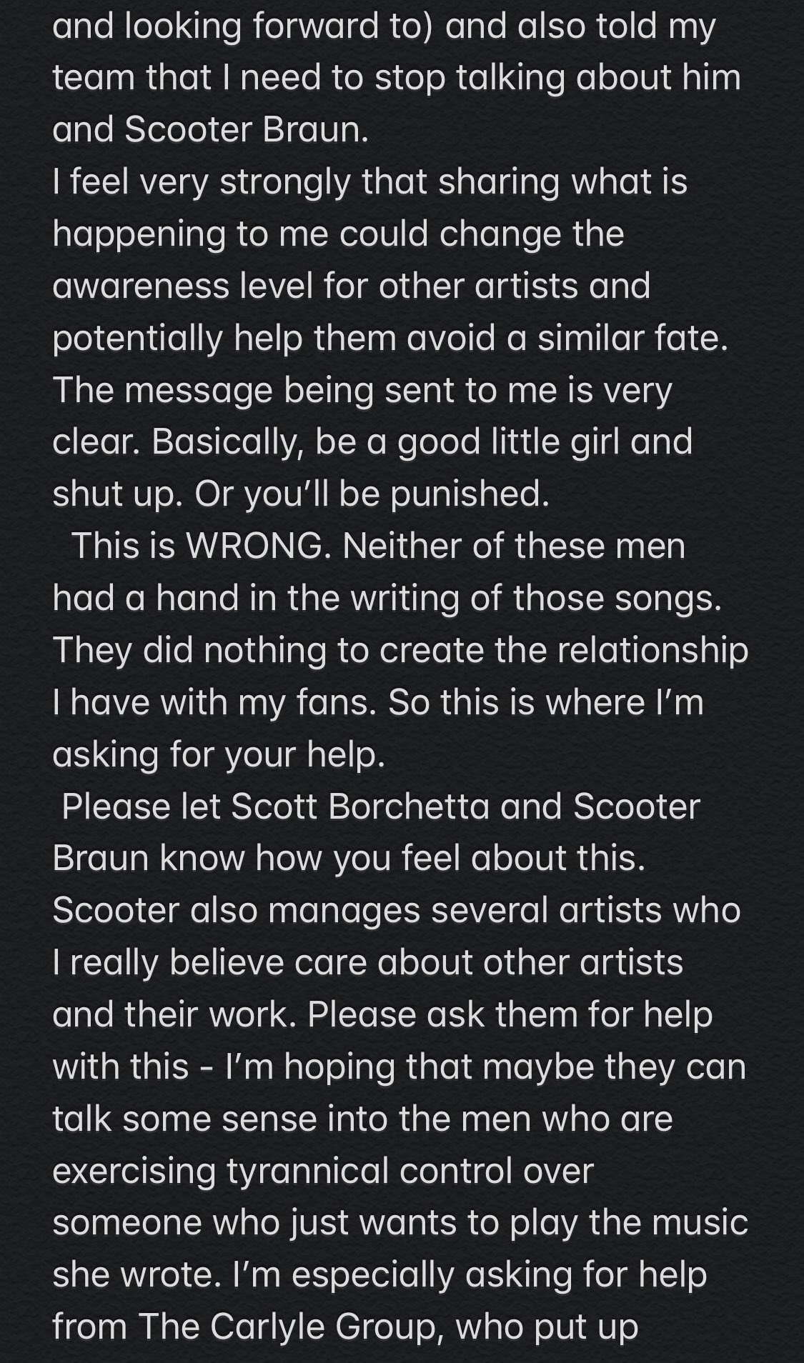 In an open letter to fans, the Pop titan alleges that her ex label head Scott Borchetta and Scooter Braun are preventing her from using her own songs for televised performances and in projects – after they brokered a deal for the catalogue. A deal that didn’t include her.