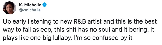 @Holliewuudd: I agree with your sentiment. K Michelle is certainly entitled to her opinion but should probably keep comments off of social media. Especially when her music career isn’t a shining example of longevity, creativity or sales. I WILL AGREE that there is something a little languid about today’s crop of young female singers and although some are very enjoyable (HER, Ari Lennox) I wouldn’t count on many of them lasting for a decade. We shall see…