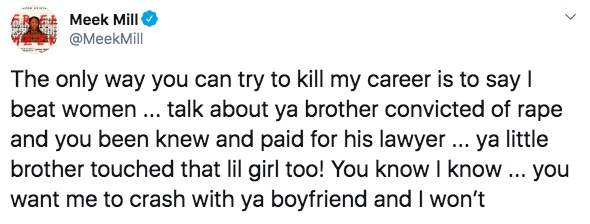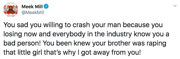 Well, now Meek has replied and he is going full throttle. Roping Minaj’s convicted rapist brother into the melee.