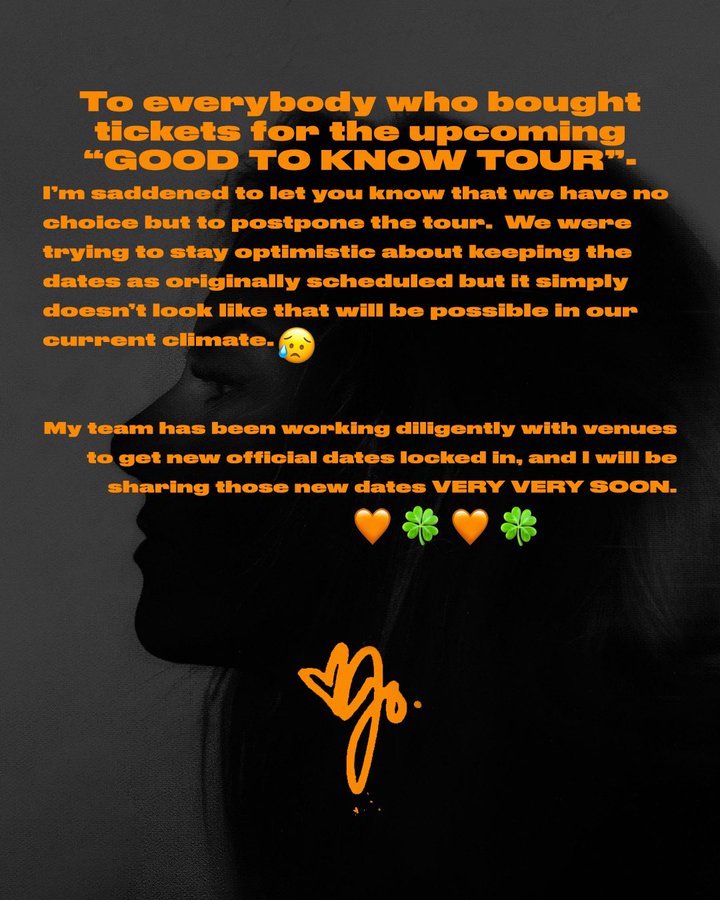 “These are unprecedented times& everything is in flux as we all try 2get a grip on what this new reality is. All industries r effected, including touring. So far, the SF date on my #goodtoknowtour has been postponed. I’ll keep u posted on everything as we have info. Love u madly.”