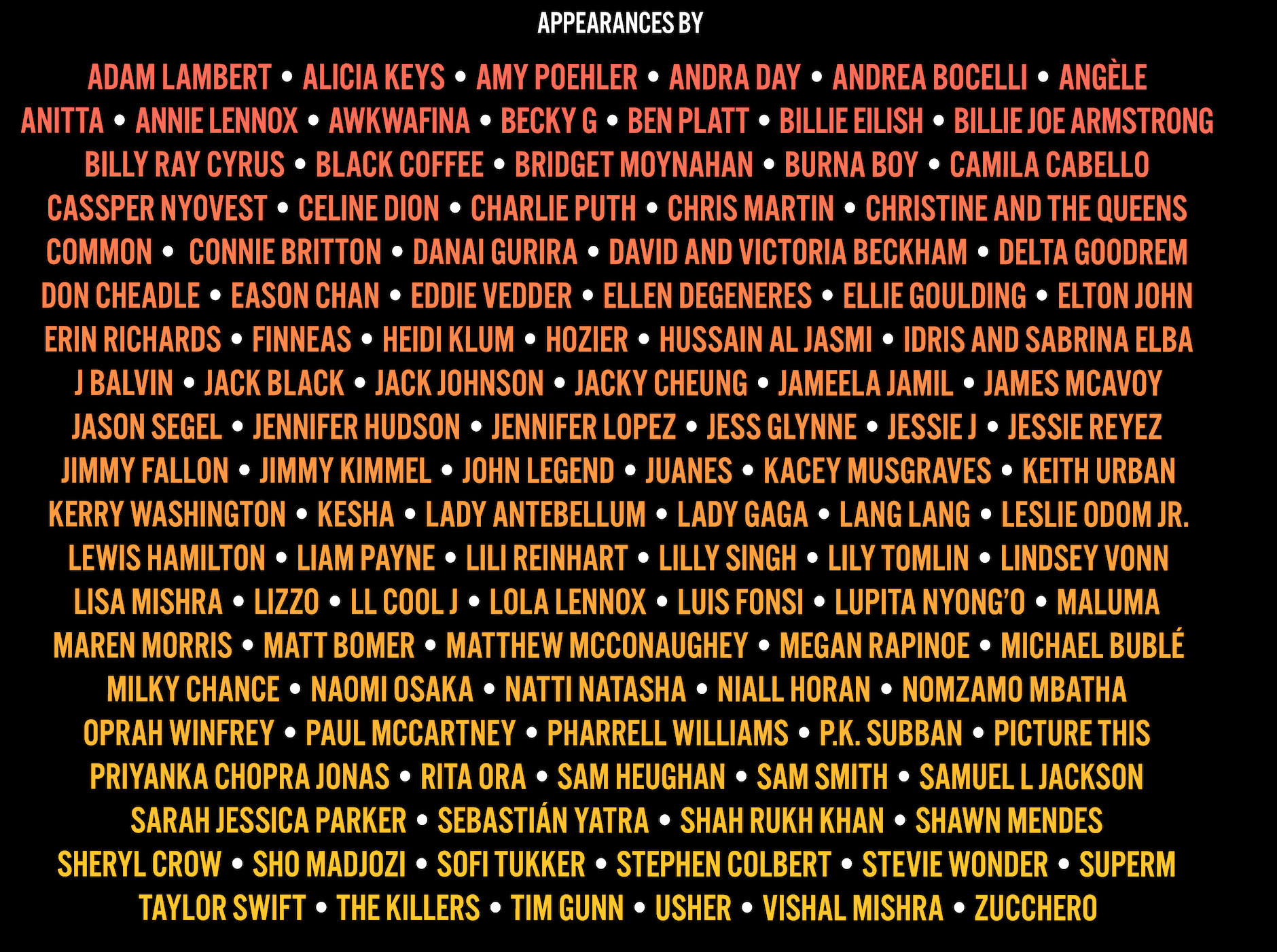 Alicia Keys, Awkwafina, Andrea Boccelli, Billie Eilish, Burna Boy, Camila Cabello, Celine Dion, Chris Martin, David Beckham and Victoria Beckham, Eddie Vedder, Ellen DeGeneres, Elton John, Idris and Sabrina Elba, J Balvin, Jennifer Lopez, John Legend, Keith Urban, Lang Lang, Lizzo, Maluma, Oprah Winfrey, Paul McCartney, Pharrell Williams, Sam Smith, Shawn Mendes, Stevie Wonder, Taylor Swift, and many more.
