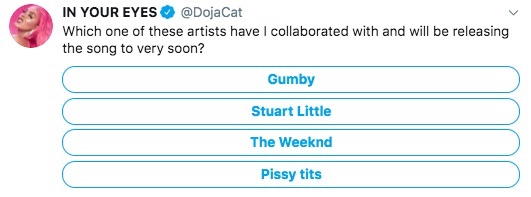 Providing additional context, she then shared a poll – further teasing the prospect of a collab with Abel: