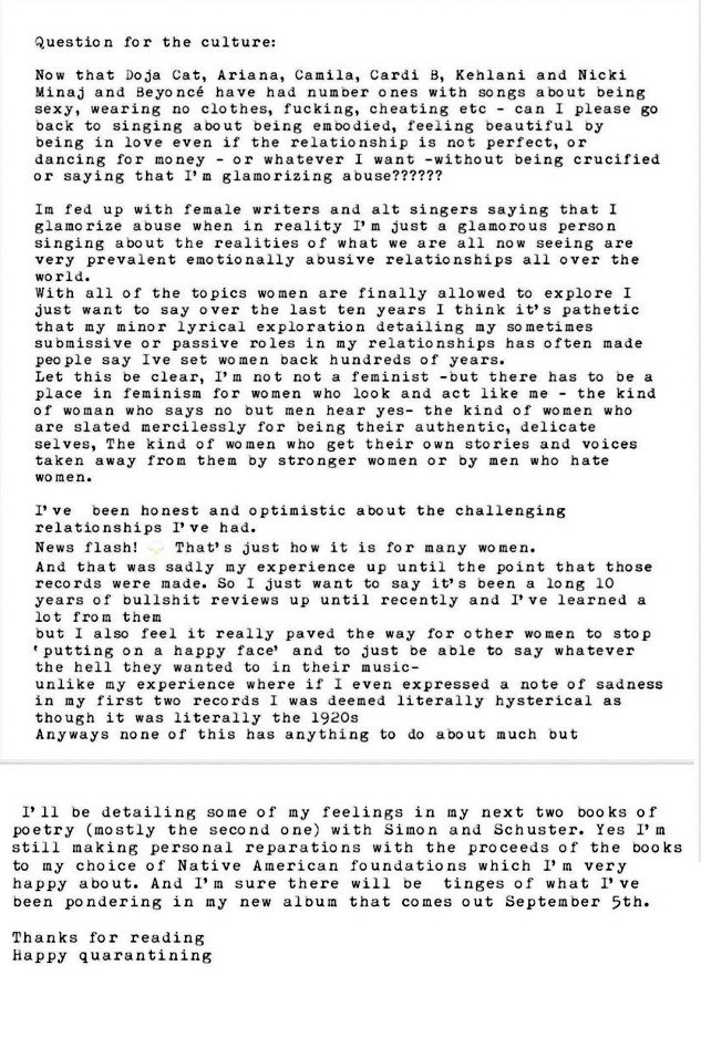 Before that reveal, she unpacked – in some detail – her frustrations with the way women such as herself are treated in music and the unfair expectations they are tasked with meeting.