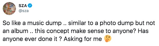 Moments ago on Twitter, the TDE chanteuse expressed her desire to drop a “music dump.” Her explanation of the concept was unpacked as: