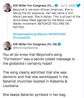Unprovoked and with little context, Miller – who is angling to rep Florida’s 18th district – took to Twitter to denounce the ‘Black Parade’ performer and even went as far as to claim that she’s “faking” her heritage and is instead an Italian named Ann Marie Lastrassi.