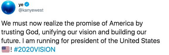We must now realize the promise of America by trusting God, unifying our vision and building our future. I am running for president of the United States ????????! #2020VISION