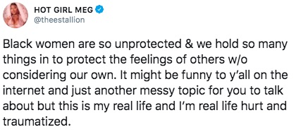 “Black women are so unprotected & we hold so many things in to protect the feelings of others w/o considering our own. It might be funny to y’all on the internet and just another messy topic for you to talk about but this is my real life and I’m real life hurt and traumatized.”