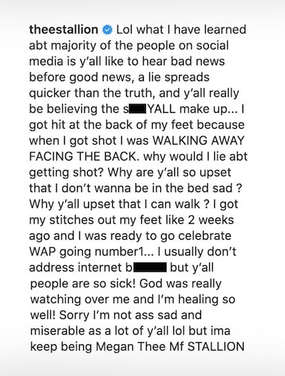 “I usually don’t address internet bullsh*t but y’all people are so sick! God was really watching over me and I’m healing so well! Sorry I’m not ass sad and miserable as a lot of y’all lol but ima keep being Megan Thee Mf STALLION.”