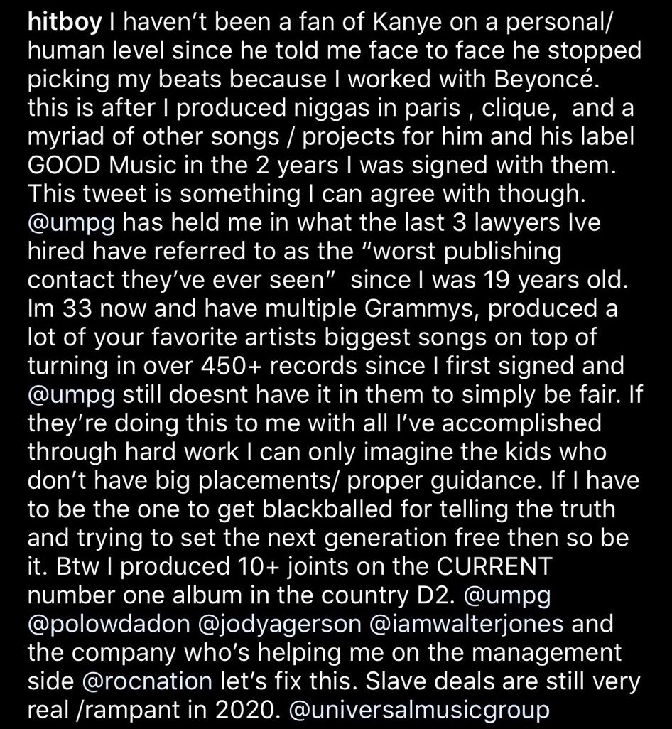 If I have to be the one to get blackballed for telling the truth and trying to set the next generation free then so be it. Btw I produced 10+ joints on the CURRENT number one album in the country D2. @umpg @polowdadon @jodyagerson @iamwalterjones and the company who’s helping me on the management side @rocnation let’s fix this. Slave deals are still very real /rampant in 2020. @universalmusicgroup”