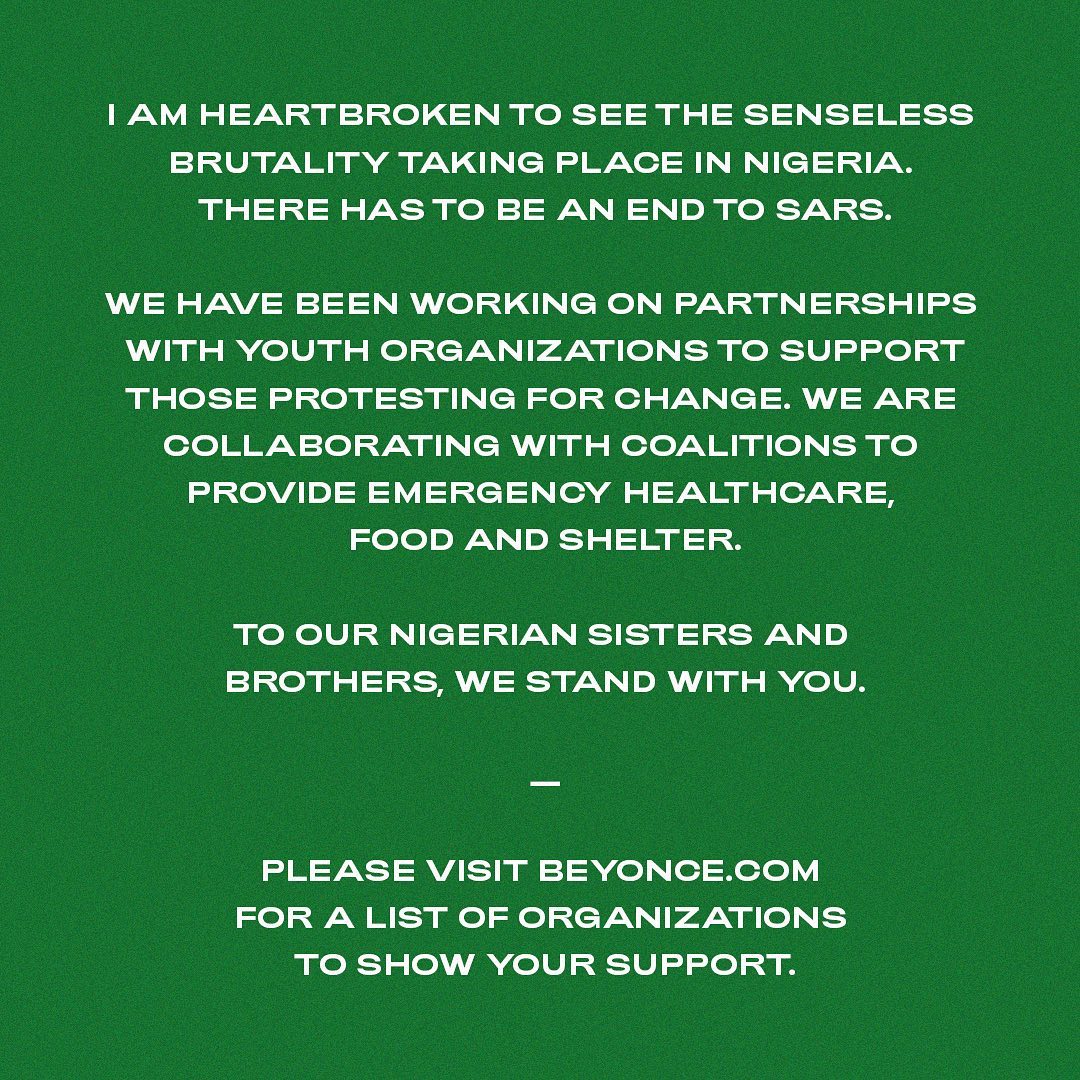 Beyonce has spoken up and out against the shocking police brutality in Nigeria.