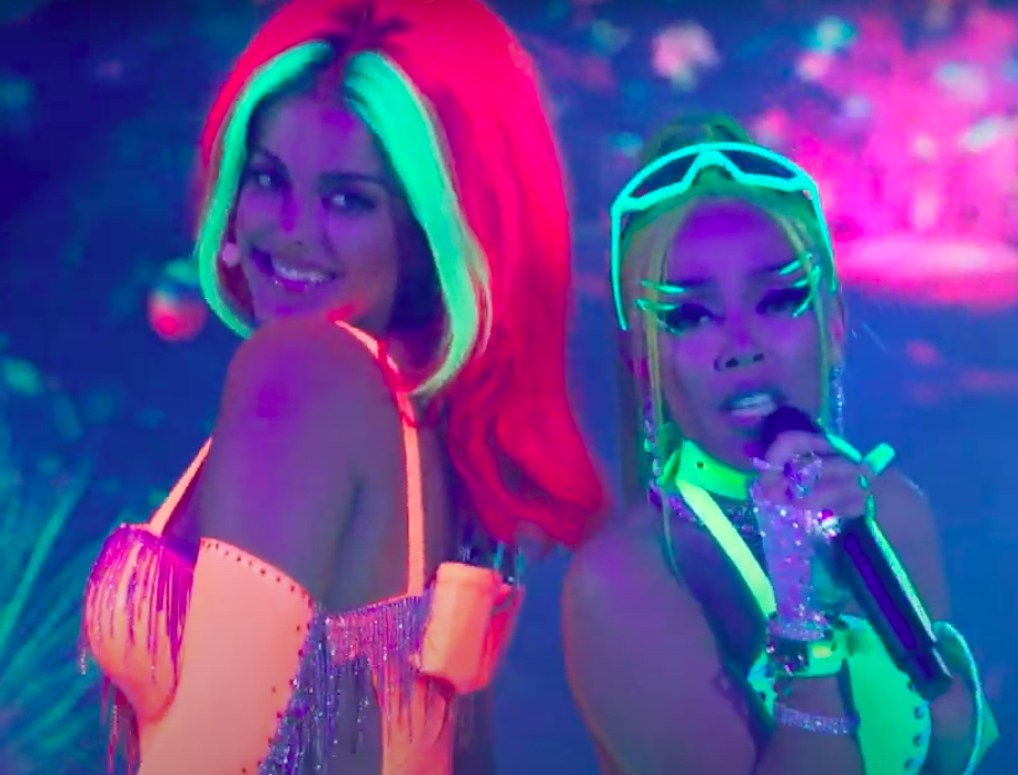 Both Rexha and Doja Cat were both dressed in neon outfits set against a rainforest background.