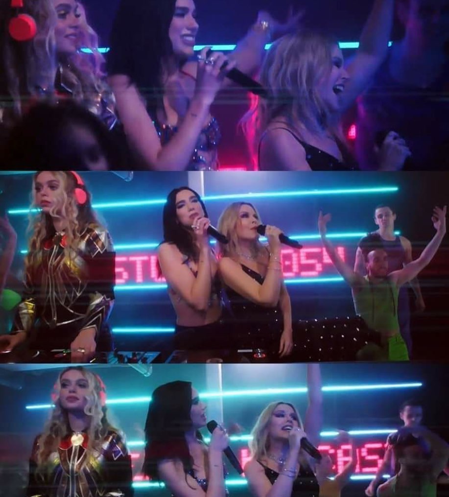 Both Lipa and Minogue performed in a club setting, where they were joined by people dancing to the track. Both singers even got in on the fun, as they took to dancing on top of table.