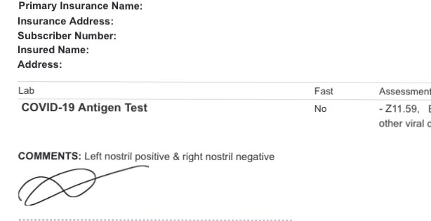 “No symptoms. Was tested for COVID. Same machine. Left nostril positive . Right nostril negative. Maybe they need to call Swiss Beats so they can do a versus between them. Funny thing is , Dr. ONLY reported the positive result. What the fack is goin on here. Rapid Test. $$$$ smh.”