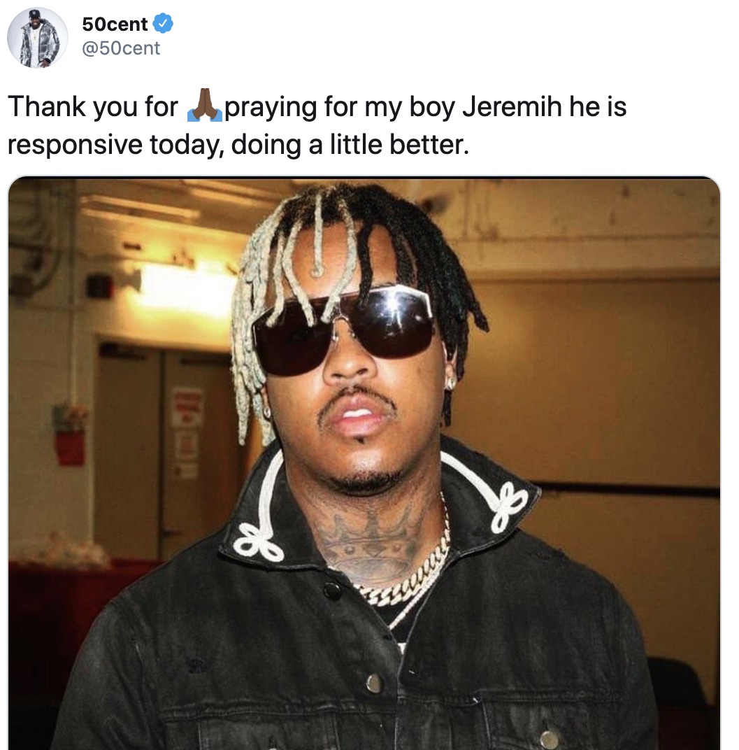 “Thank you forpraying for my boy Jeremih he is responsive today, doing a little better.”