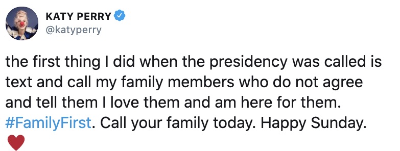 “the first thing I did when the presidency was called is text and call my family members who do not agree and tell them I love them and am here for them. #FamilyFirst. Call your family today. Happy Sunday.”