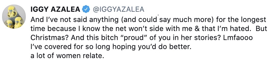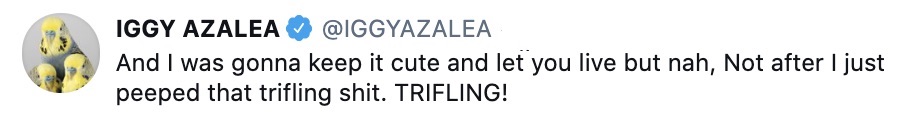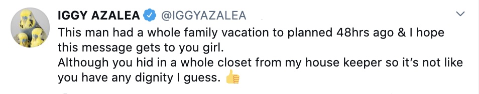 Iggy is right about the GP not siding with her. If what she said is true, that’s a shame. But she also has some responsibility for even getting with men like that. Women have to do better, but that’s a whole ‘nother conversation. Hopefully she is putting that same tweeting energy into her career. She can throw a bop or two when she wants to…