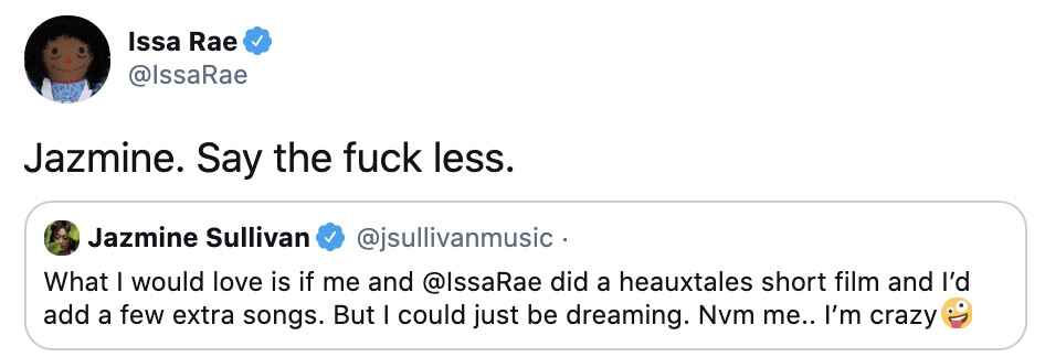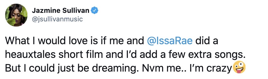 “What I would love is if me and @IssaRae did a heauxtales short film and I’d add a few extra songs. But I could just be dreaming. Nvm me.. I’m crazy”