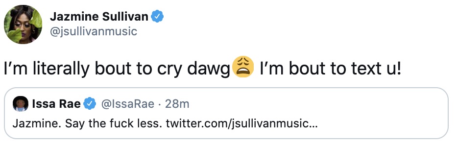 “I’m literally bout to cry dawg. I’m bout to text u!”