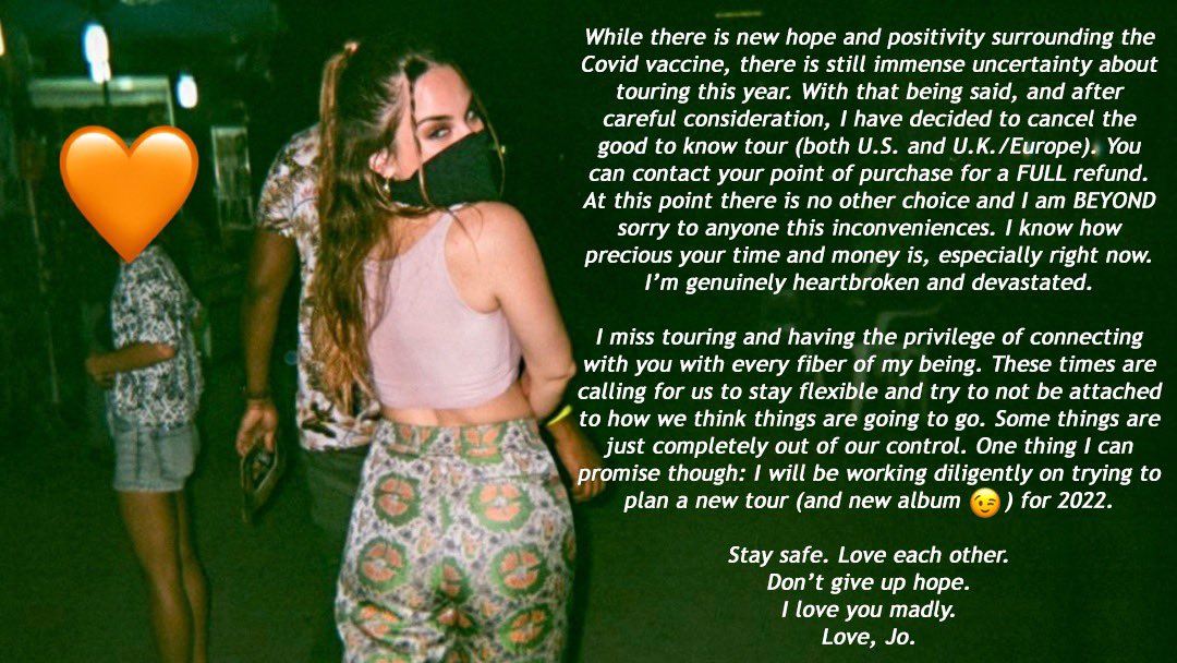 The trek had been set to support Jo’s album of the same name, which boasts three iterations – the standard original edition, a deluxe and an acoustic version.