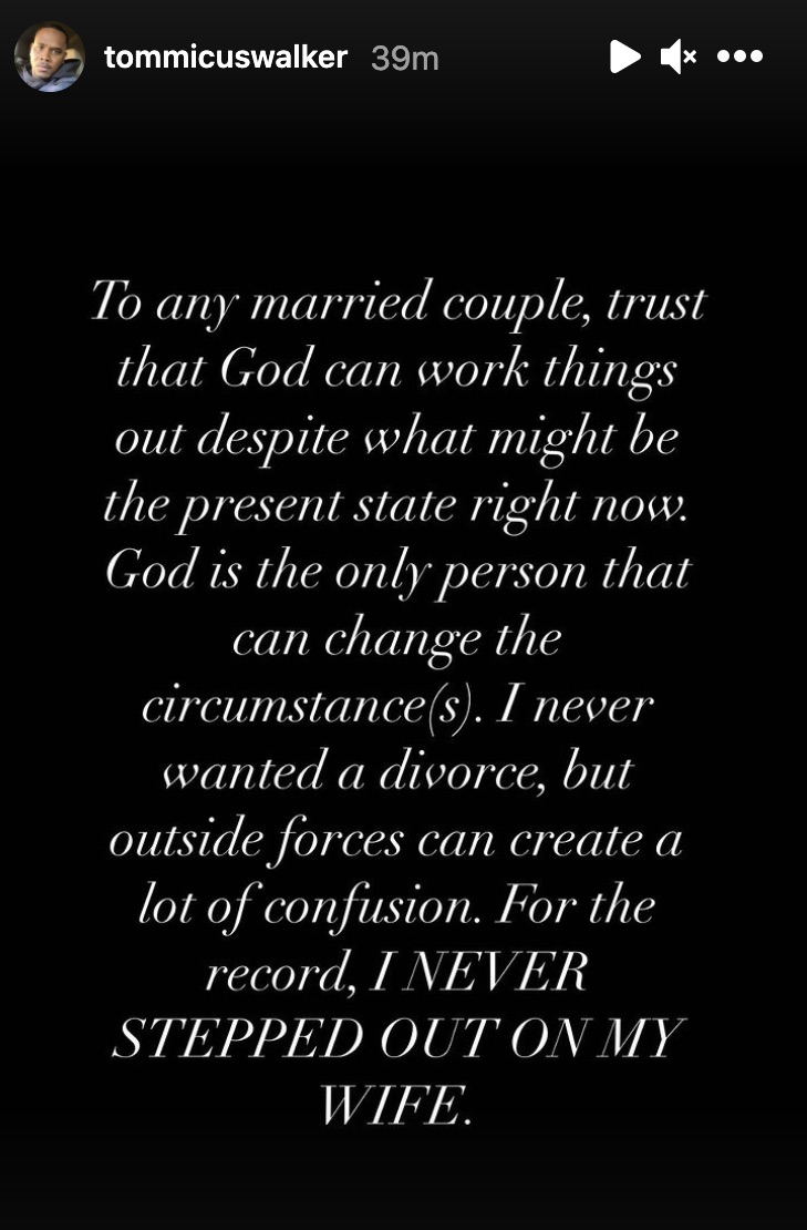 Update: Walker has issued his own comments insisting he didn’t want to split. He also claims he did not cheat: