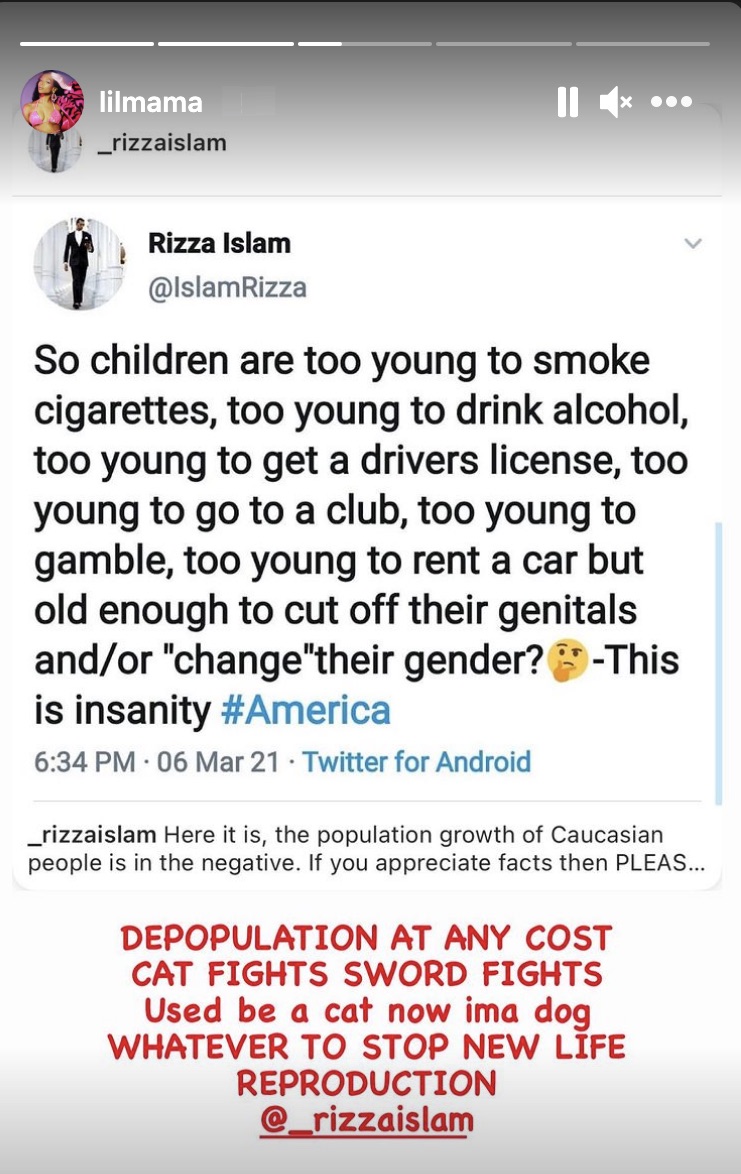 Taking to Instagram Stories, the rapper/presenter re-shared a post from cultural critic Rizza Islam – who slammed young people who “cut off their genitals” and “change their gender.” He went on to add “This is insanity #America.”