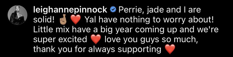 “Perrie, Jade, and I are solid! Yal have nothing to worry about! Little Mix have a big year coming up and we’re super excited. Love you guys so much, thank you for always supporting.”