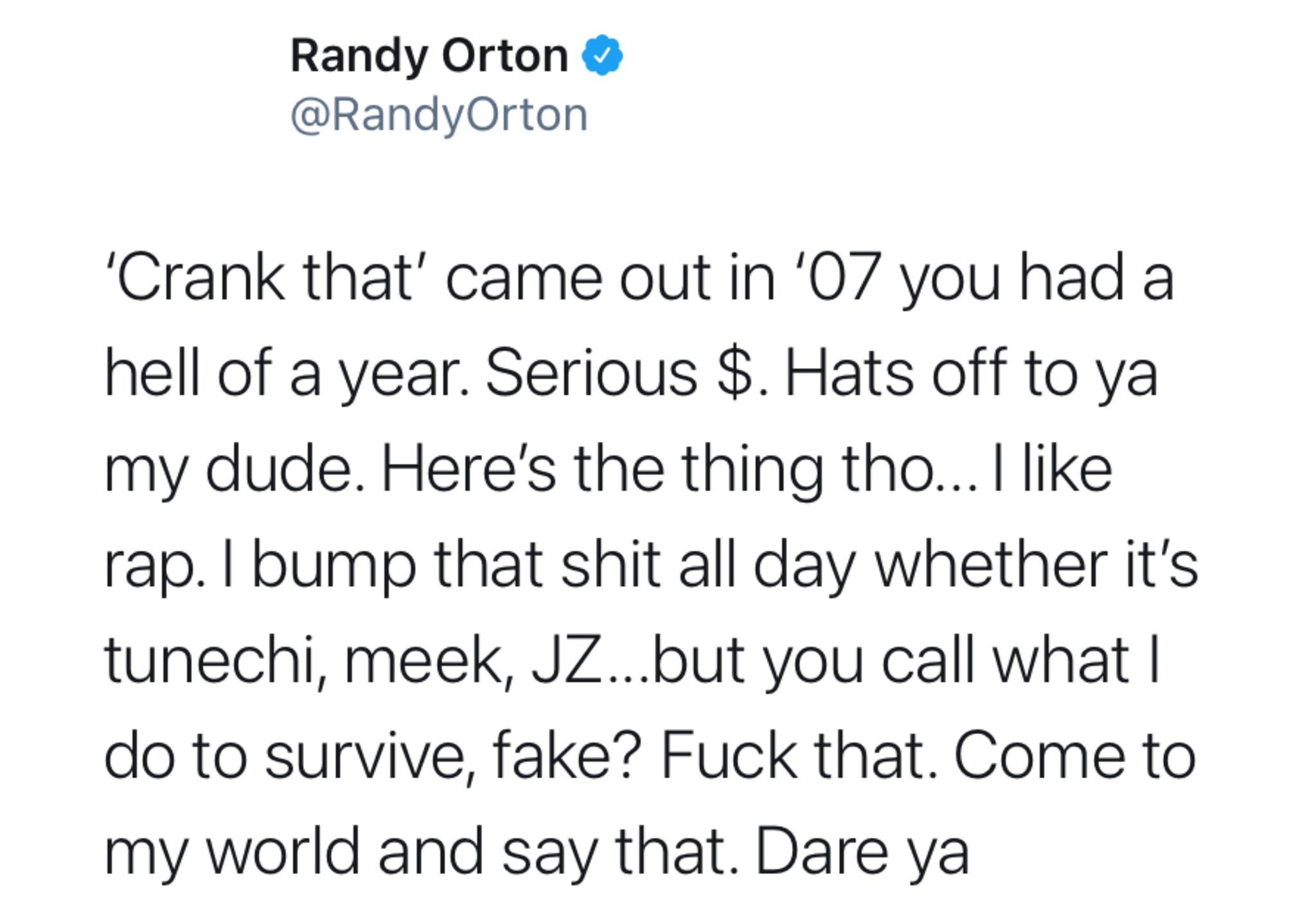 “‘Crank that’ came out in ‘07 you had a hell of a year. Serious $. Hats off to ya my dude. Here’s the thing tho… I like rap. I bump that s**t all day whether it’s tunechi, meek, JZ…but you call what I do to survive, fake? F**k that. Come to my world and say that. Dare ya”