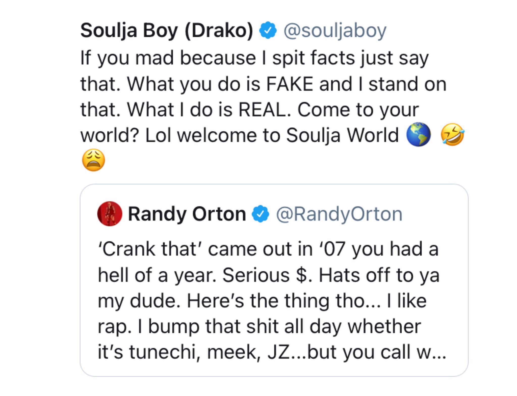 As unlikely beefs go, few could have predicted the growing feud cooking between Soulja Boy and WWE‘s Randy Orton.