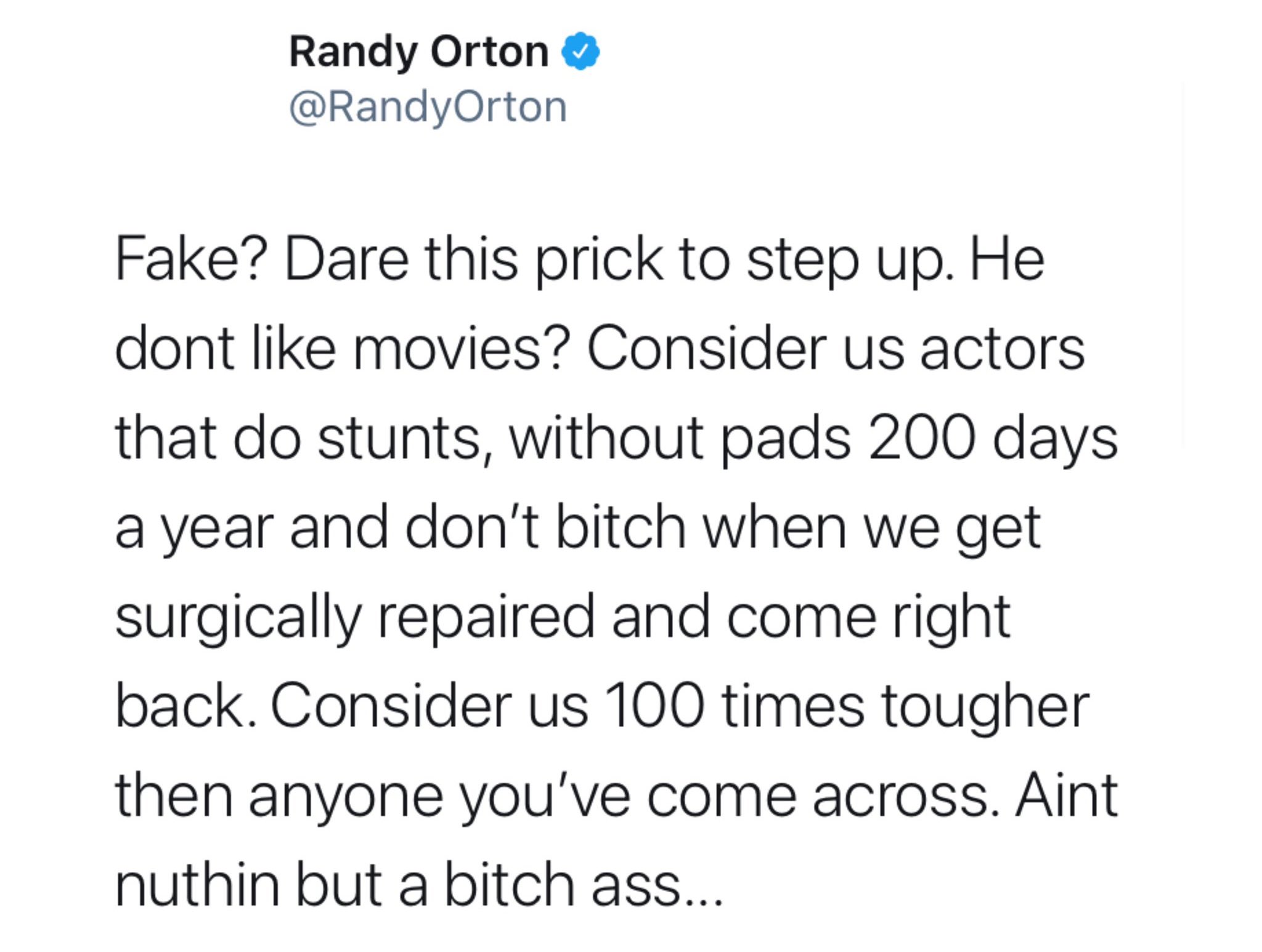 “Fake? Dare this p***k to step up. He dont like movies? Consider us actors that do stunts, without pads 200 days a year and don’t b***h when we get surgically repaired and come right back. Consider us 100 times tougher then anyone you’ve come across. Aint nuthin but a b***h ass…”
