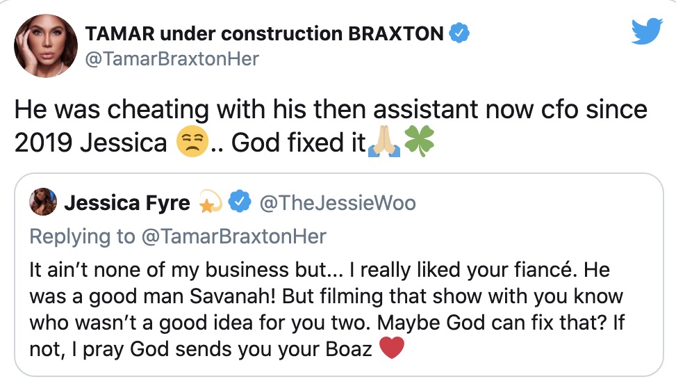 “It ain’t none of my business but… I really liked your fiancé. He was a good man Savanah! But filming that show with you know who wasn’t a good idea for you two. Maybe God can fix that? If not, I pray God sends you your Boaz.”