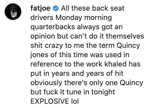 “All these back seat drivers Monday morning quarterbacks always got an opinion but can’t do it themselves sh*t crazy to me the term Quincy jones of this time was used in reference to the work Khaled has put in years and years of hit obviously there’s only one Quincy but f*ck it.”