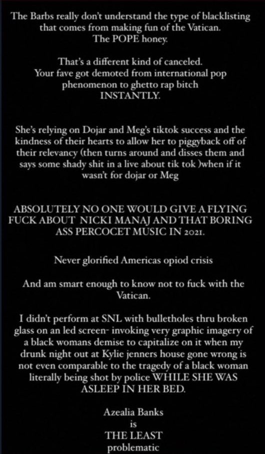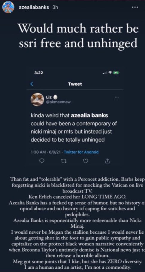 U have gotta be VERY slow and dumb to listen to anything Azealia Banks has to say about anybody ???????????? compare Nicki’s career to hers and you have your answer ???? Nicki Minaj is the richest female rapper in HISTORY. She’s the MOST FOLLOWED rapper on Instagram in HISTORY. Her numbers are major on TikTok. And don’t front like that dont matter because this generation is built more on brand than actual talent these days. She’s as relevant NOW than she’s ever been LOL