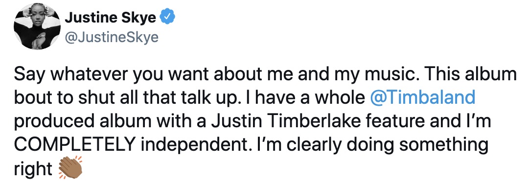 Say whatever you want about me and my music. This album bout to shut all that talk up. I have a whole @Timbaland produced album with a Justin Timberlake feature and I’m COMPLETELY independent. I’m clearly doing something right