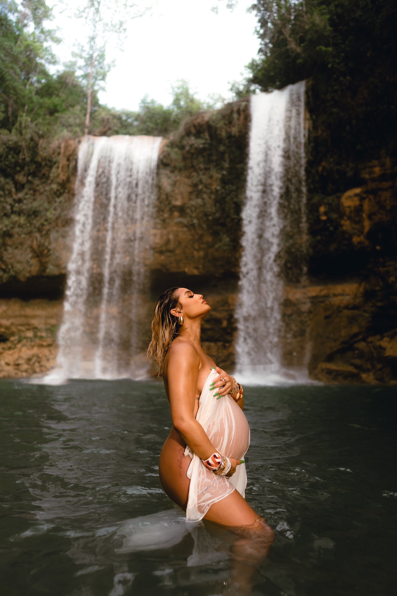 Moments ago, the starlet announced that she is pregnant via a stunning waterfall photoshoot.