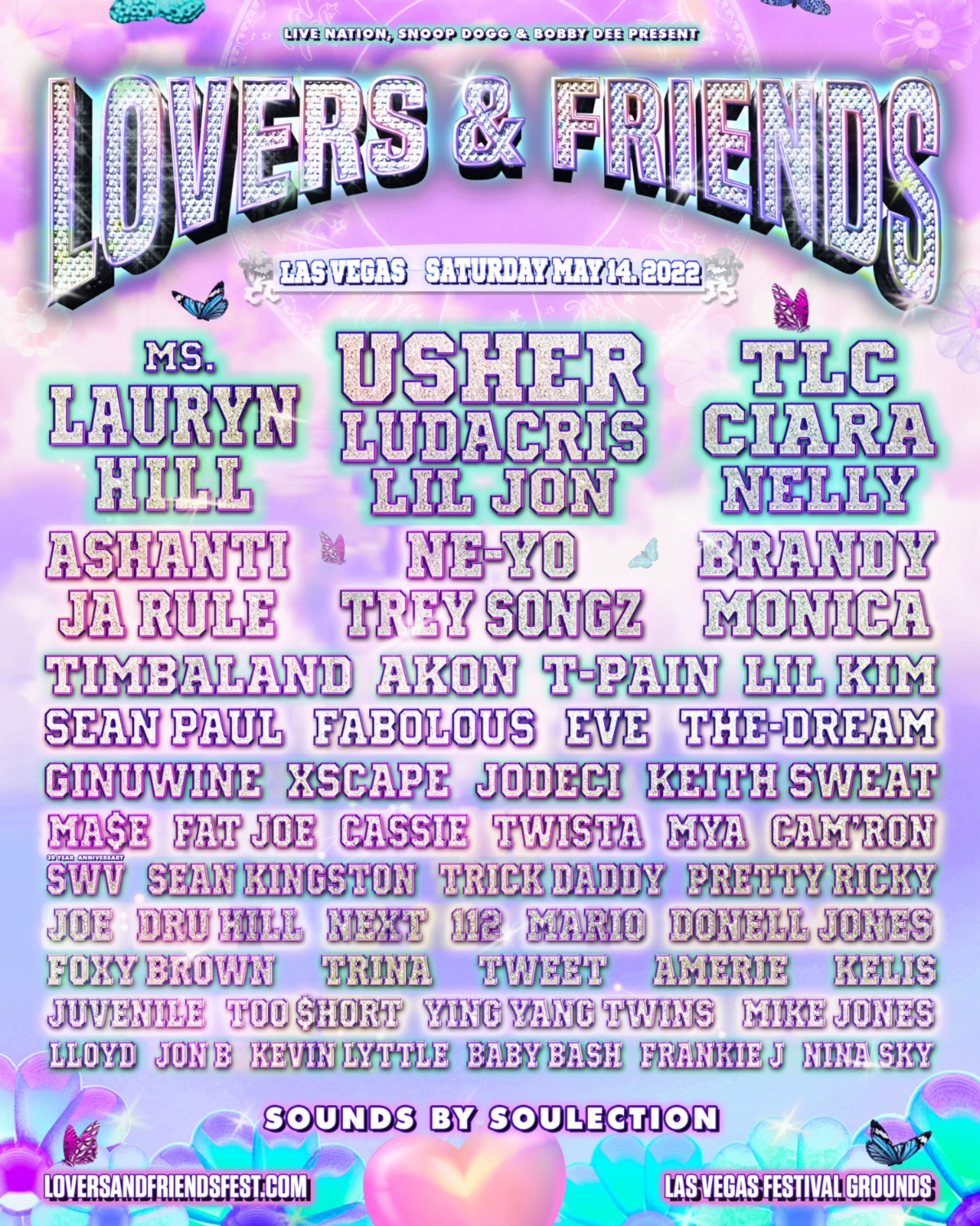 The full festival lineup is: Ms. Lauryn Hill, Usher, Ludacris, Lil Jon, TLC, Ciara, Ashanti, Ja Rule, Trey Songz, Brandy, Monica, Nelly, Akon, Sean Paul, T-Pain, Lil Kim, Boyz II Men, Xscape, Timbaland, Fabolous, Jodeci, Keith Sweat, Ginuwine, Eve, Cassie, Fat Joe, The-Dream, Ma$e, Twista, Sean Kingston, SWV, Mya, Cam’ron, Trick Daddy, Pretty Ricky, Dru Hill, Next, 112, Joe, Donnell Jones, Foxy Brown, Trina, Tweet, Amerie, Kelis, Ying Yang Twins, Mike Jones, Montell Jordan, Nina Sky, Jon B, Baby Bash, Frankie J, Mark Morrison and Kevin Lyttle, with sounds by Soulection.