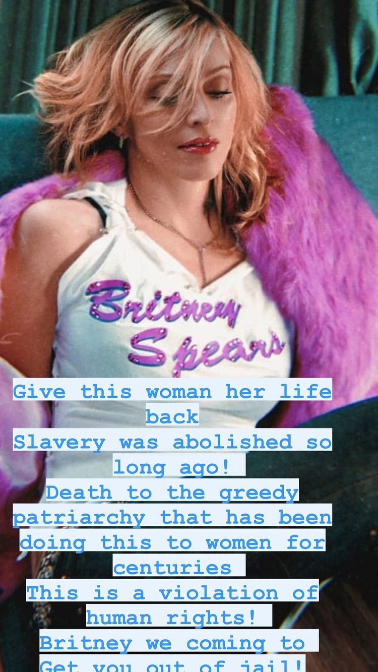 “Give this woman her life back. Slavery was abolished so long ago! Death to the greedy patriarchy that has been doing this to women for centuries. This is a violation of human rights! Britney we coming to Get you out of jail!”
