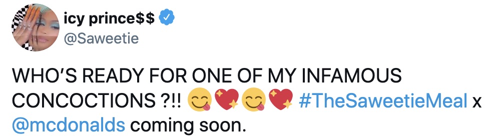Moments ago, she teased what has been christened The Saweetie Meal – which will be unboxed on August 9.