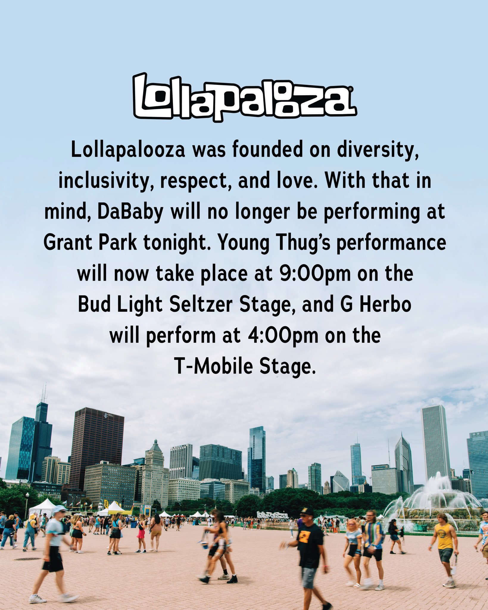 “Lollapalooza was founded on diversity, inclusivity, respect, and love. With that in mind, DaBaby will no longer be performing at Grant Park tonight. Young Thug will now perform at 9:00pm on the Bud Light Seltzer Stage, and G Herbo will perform at 4:00pm on the T-Mobile Stage.”