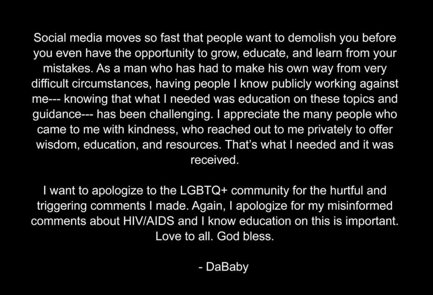 I want to apologize to the LGBTQ+ community for the hurtful and triggering comments I made. Again, I apologize for my misinformed comments about HIV/AIDS and I knew education on this is important. Love to all. God bless. – DaBaby”