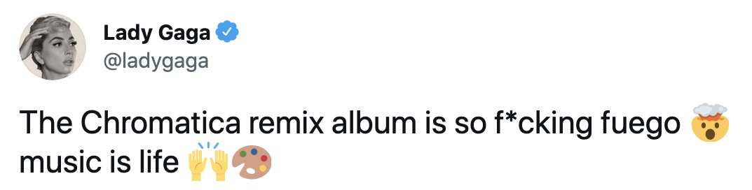 “The Chromatica remix album is so f*cking fuego ???? music is life ????????”