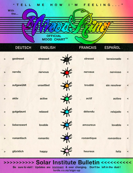 The multi-colored chart features various emotions and moods along with a corresponding color. Such feelings as romantic, lovable, and happy are all featured. At the top of the chart are the words “mood ring,” which correlate to a song on her album.