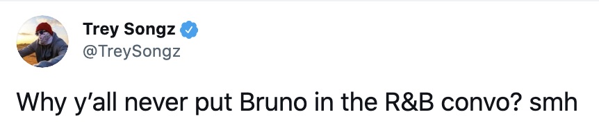 He shoulda ask . Why nobody buy his music no more or when they last time he had a hit? Basically mind his business. He just want attention. He should be upset about his own career. Now I guess he hoping Bruno will reach out and collab to put him on the charts again. Did he really have to tweet this . Was it really bothering him this much? Bruno is pop not r& b anyway. The slow music can be considered but he put out mostly pop hits. He put out great music and a great artist . Who will be around for awhile. Everything he drops is good.