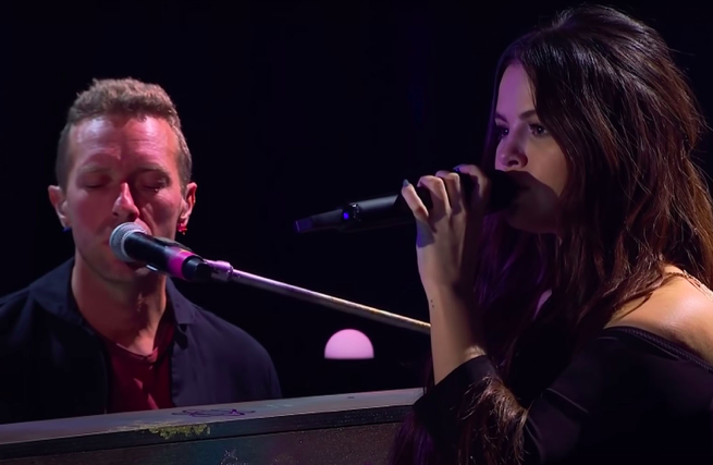 Singer Chris Martin can be seen sitting at his piano as he and Gomez harmonize on the tune. The background is full of celestial images, which keeps with the album’s otherworldly theme.